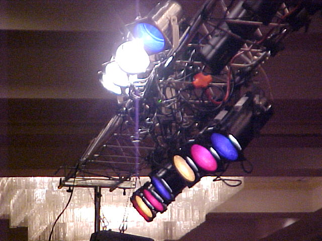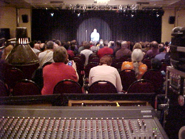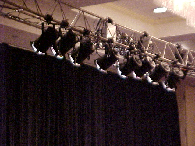 Then reset for a 5:00 PM concert on Sunday night. The venue was set up theater style with just under 700 seats. Our modest 10 speaker FOH system was adequate for the entire weekend, including the most demanding concert portions. Due to the variety of entertainment we patched and re-patched our mixer a couple of times throughout the weekend. Friday's concert set up was for a 7 pc band, but Sunday's set up was only for a 4 pc band, so organizing our mixer inputs meant moving vocal mic assignments - and also wireless mic requirement changes. On Saturday the day time schedule used for the most part just 1 or 2 wireless mics. But the "cabaret" in the evening required ad DI box and one floor monitor. Our lighting service included a follow spot, which was used for the concerts, cabaret, and single "acts". The spot is simple, but very affective. |